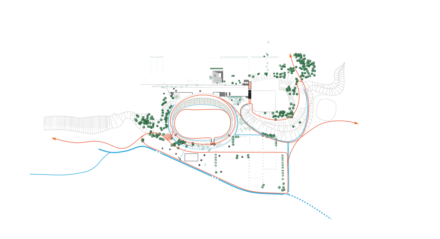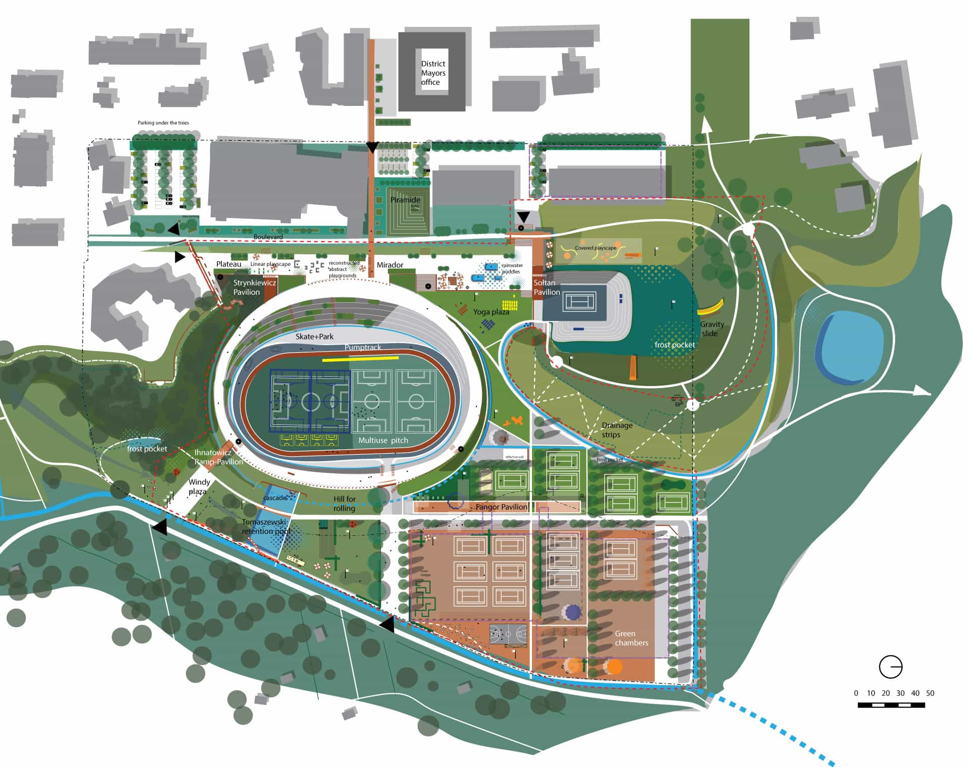 WARSZAWIANKA, an iconic modernist sports centre, was conceived in the 50s as a complex mechanism that connected humans with nature. Fundamental ideas presented within the original design remain vital in this proposal, leaving any intervention to take the form of preservation by management. The space is imbued with new life through thoughtful exposition of modernist heritage and its enhancement for the evolving social and natural environment. Warszawianka thus becomes a living monument, a platform that connects humans with nature through physical activity and culture.The grounds are to be perceived as a contemporary, complex equivalent to a sundial that will enable the users to place themselves in direct and indirect relation to BODY, TIME and GRAVITY.