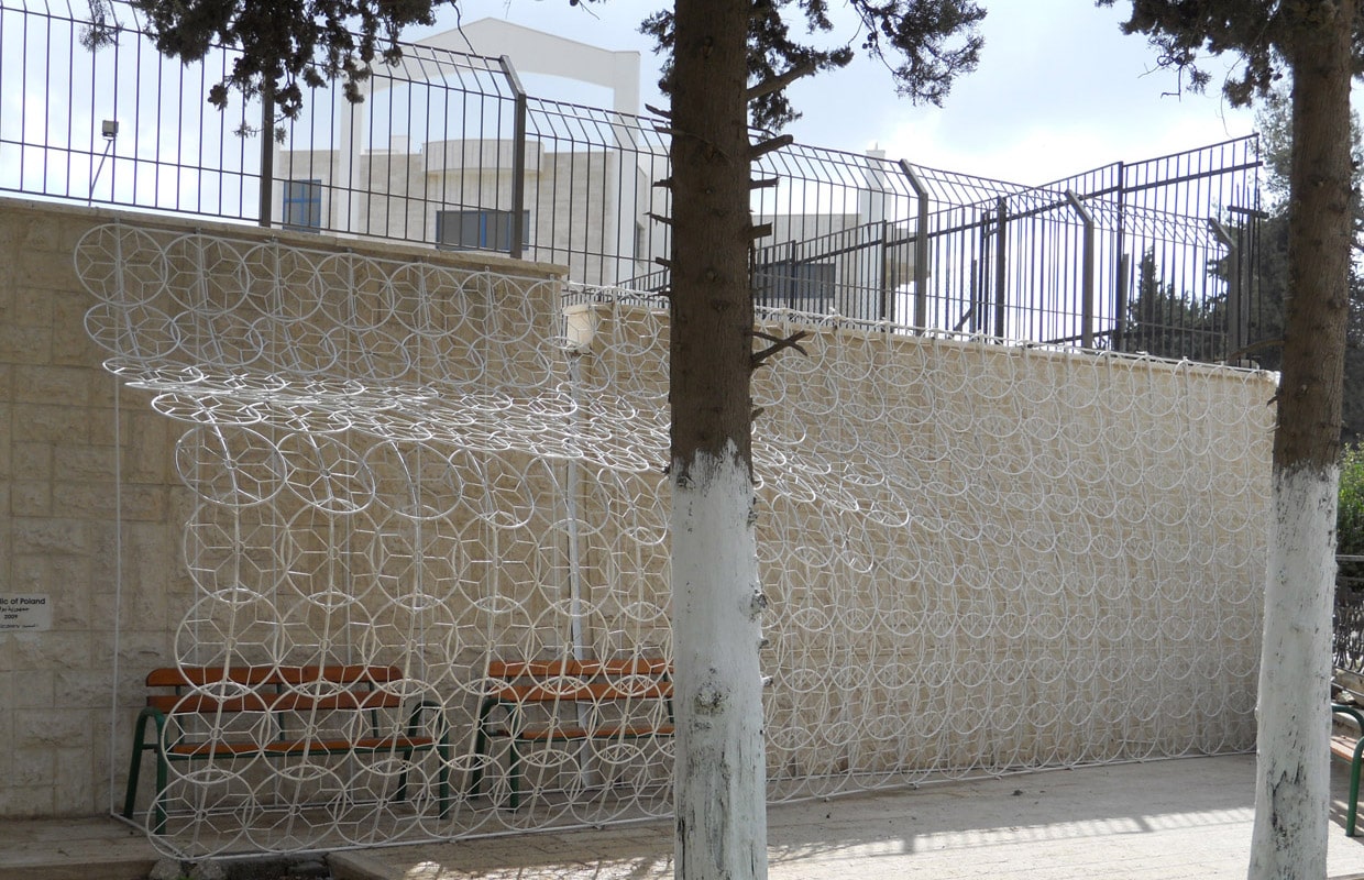 Garden of Nations, one of the rare public spaces is the booming Palestinian capital was ment to become a representation space, where art pieces donated by different countries would coexist. Relatively small scale of the park leads to inevitable effect of visual overcrawding and competition of free-standing sculptures. To minimise the danger of entering into the same logic The Lace is a shadow-maker „glued” to the wall encompassing the park.